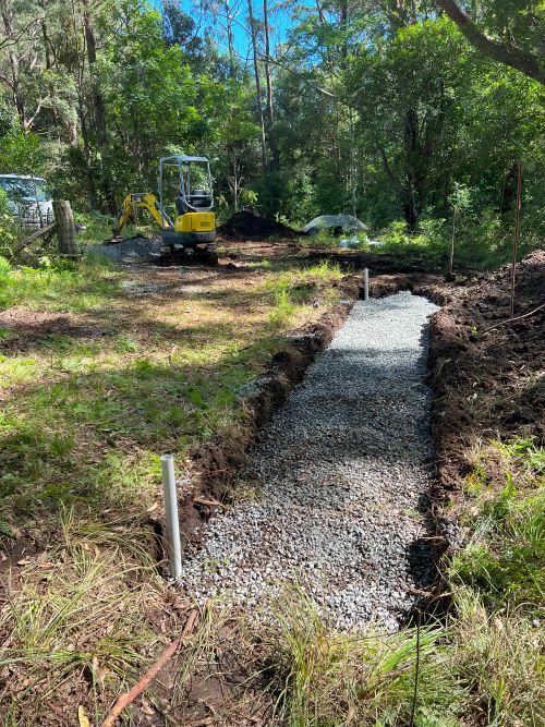 As groundwater accumulates in the adjacent soil, it naturally flows into the gravel trench, enters the perforated pipe, and is redirected to a designated safe discharge area. This system operates efficiently below ground level and does not rely on visible grates or channels, making it particularly beneficial in clay-heavy soils, which are prevalent in Wollongong and the wider Illawarra region, where traditional drainage methods may fail.